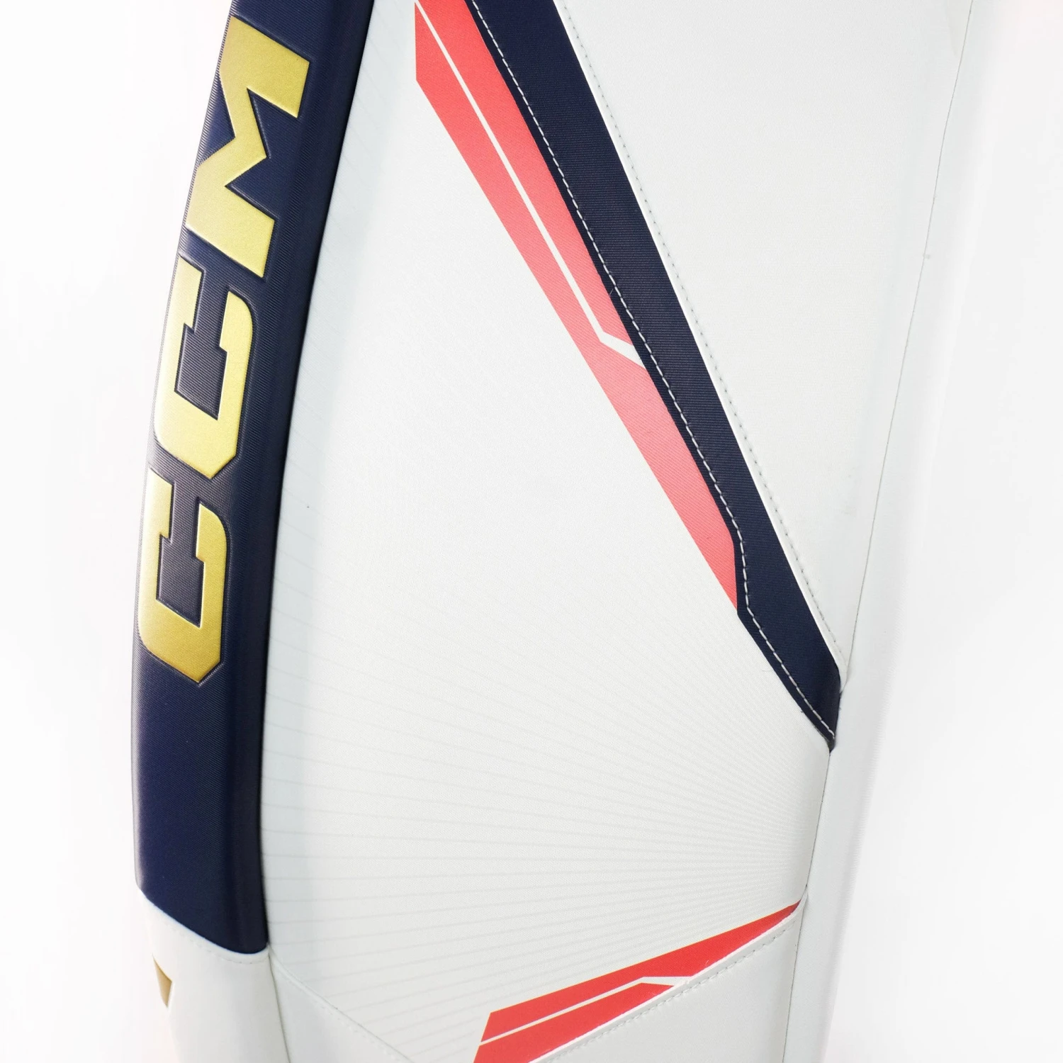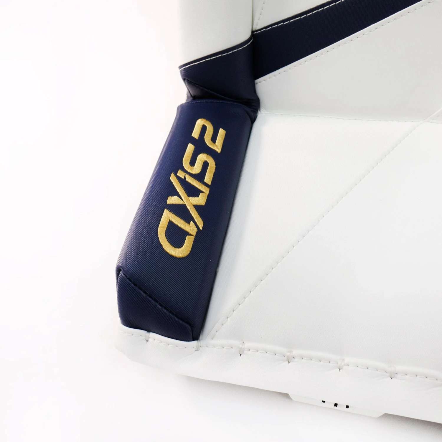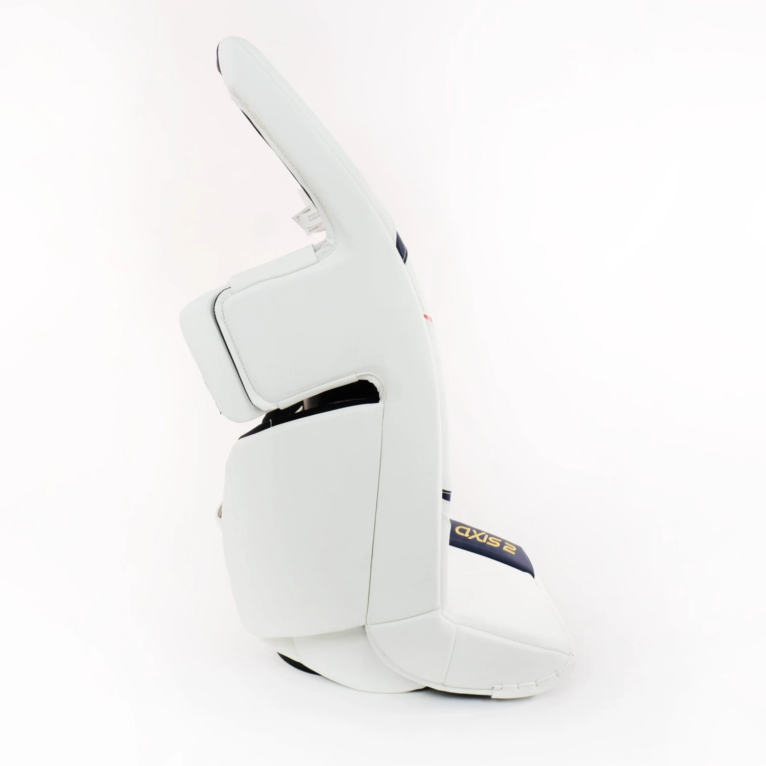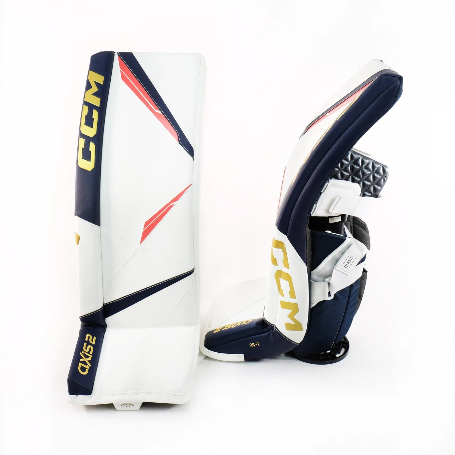 The CCM Axis 2 Senior Goalie Leg Pads come in white colouration in stock and the following sizes: 33+1, 34+1, 34+2, and 35+2. Axis 2 Intermediate pads are only available in custom.