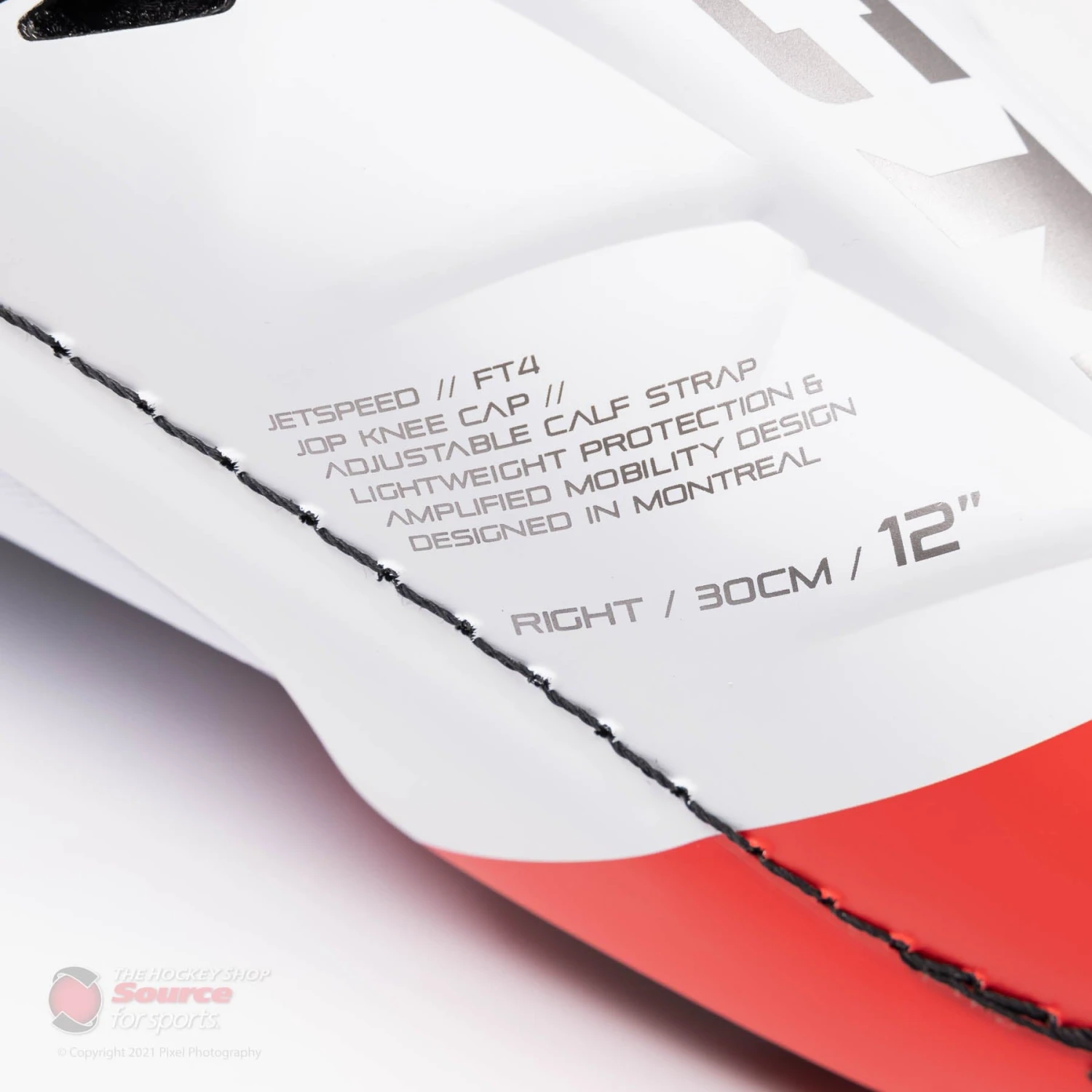The CCM Jetspeed FT4 shin guard was engineered to feature protection for elite and performance level youth players. It comes with a narrow anatomical design to maximize freedom of movement. The new profile of the FT4 shin and knee caps gives players a perfect balance of coverage without being too wide. The FT4 is really comfortable and has a locked in fit that virtually eliminates slippage once strapped in.