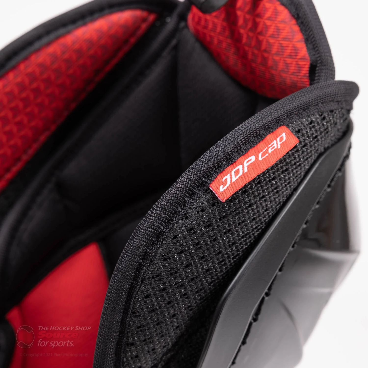 A new anatomical, narrower design gives the FT4 a connected fit that doesn’t feel bulky. While it has a narrower profile, players who frequently block shots won’t be disappointed with the coverage it gives and will love the protection it offers.