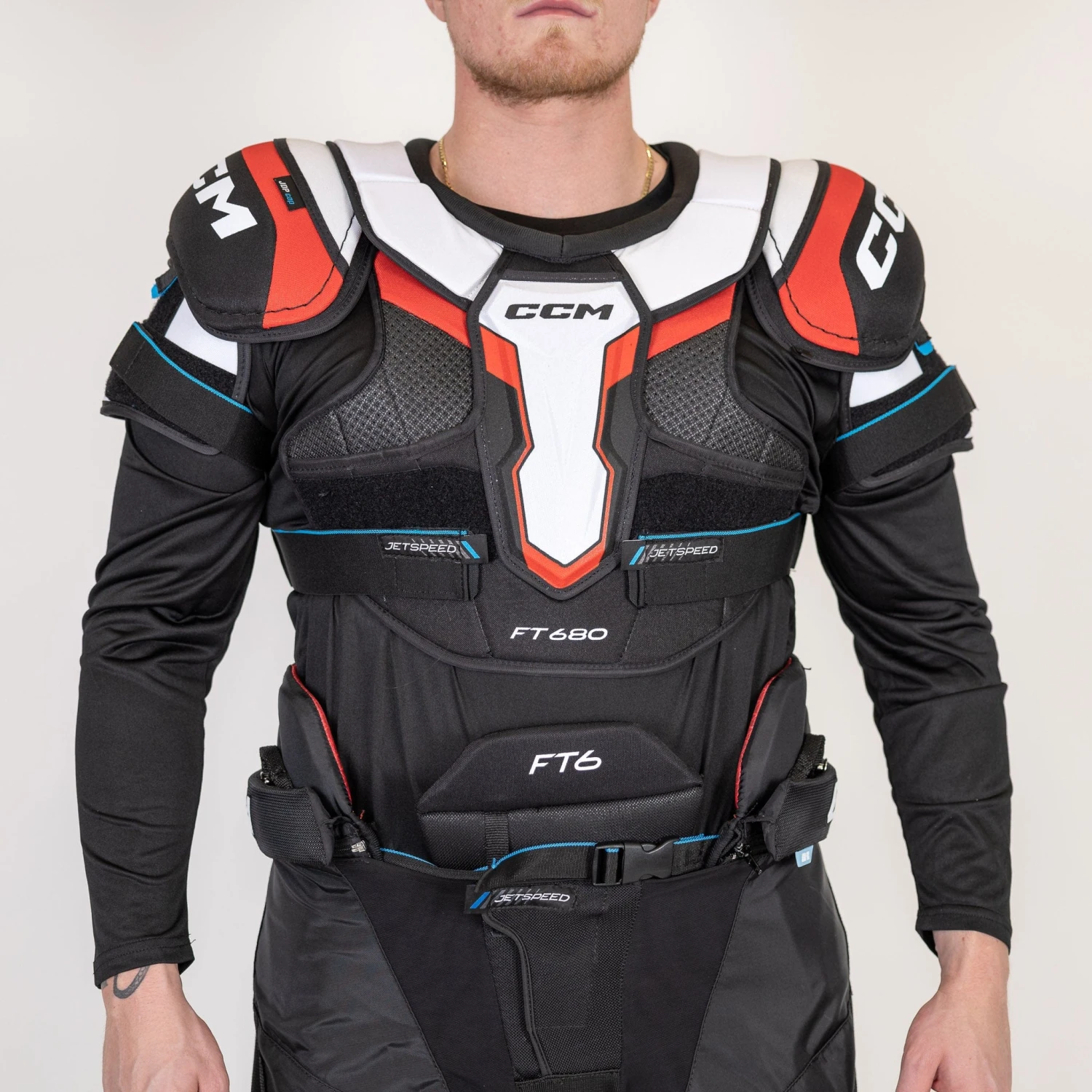 CCM’s next shift in focus for 2023 is in the new Jetspeed FT6 line. The Jetspeed FT 680 is a more affordable option for the recreational player who’s still looking for a low-profile look, good flexibility in their gear, and high-level protection. These shoulder pads feature dual-layer front construction, JDP design caps, a vented front base, and additional coverage in both the front panel and clavicle areas.
