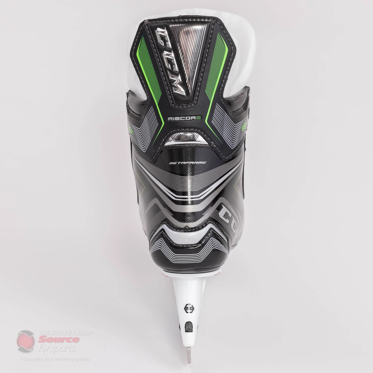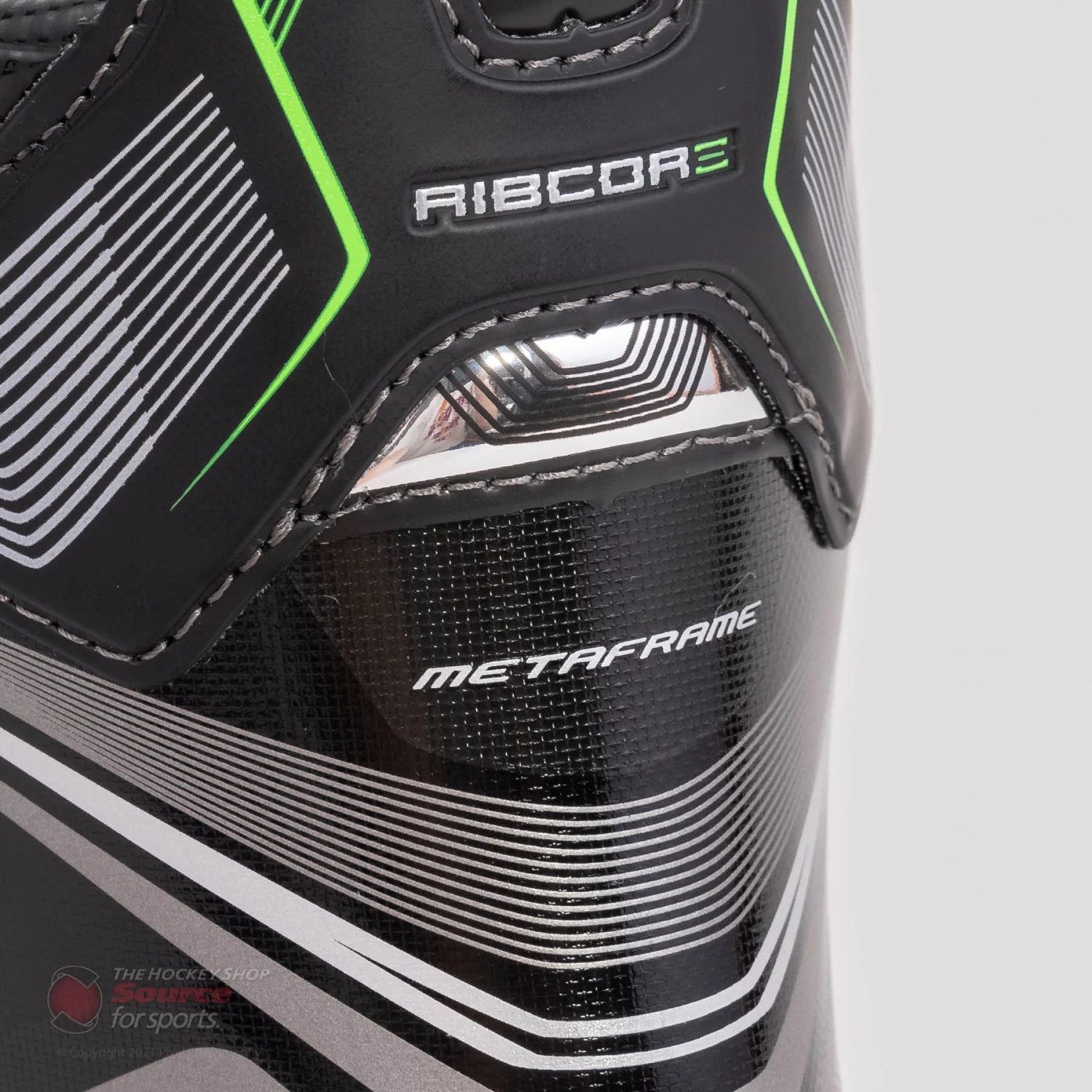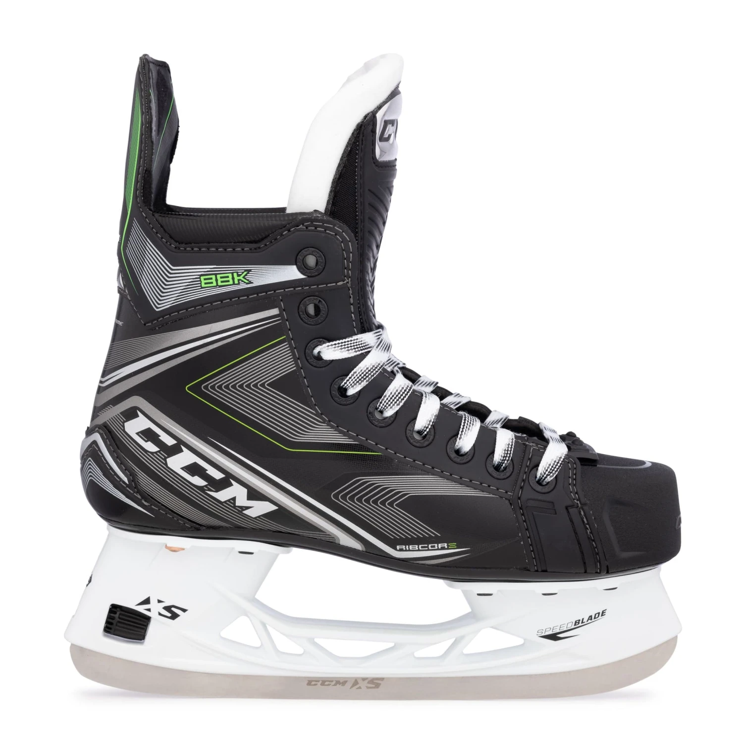 The new graphic for the CCM Ribcore 88k features a glossy silver lined pattern overtop a black finish. CCM finishes the boot off nicely with their classic Ribcore green accents along the tendon guard and base of the heel.