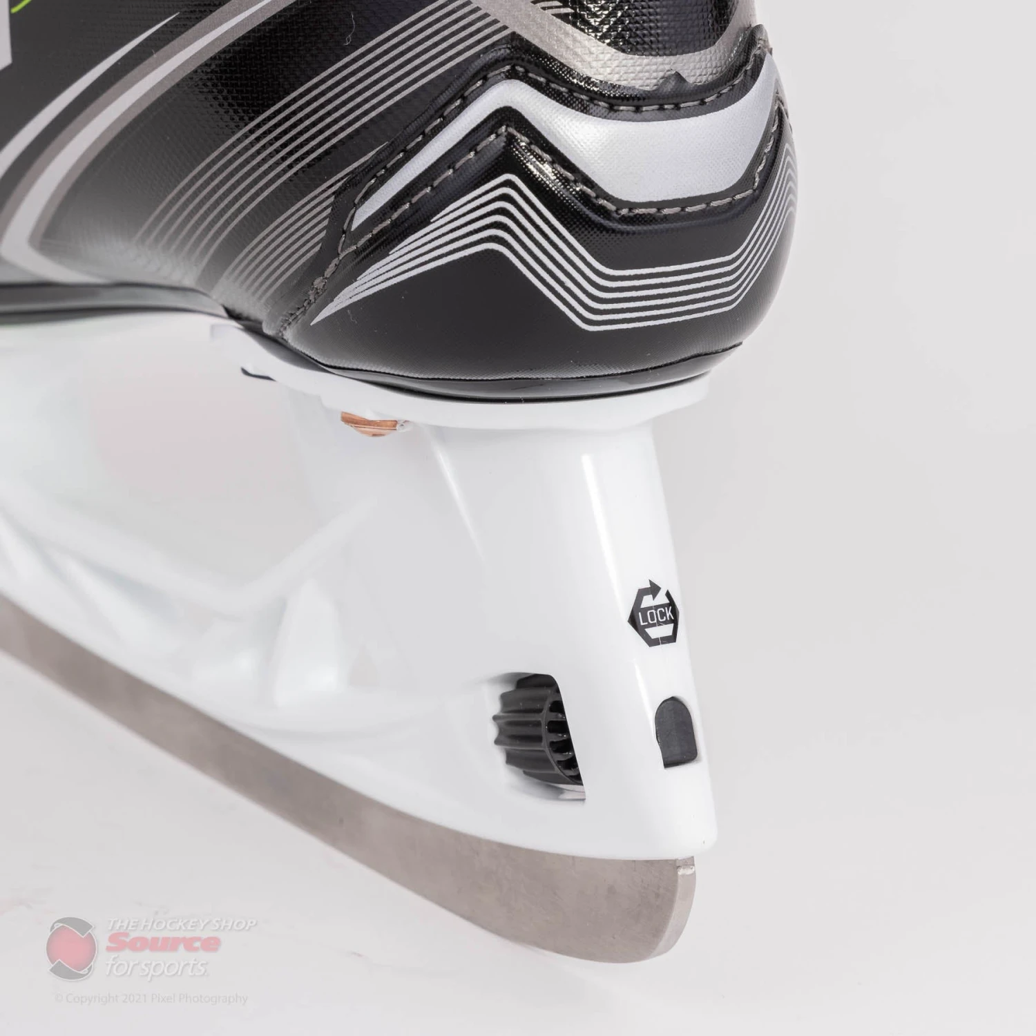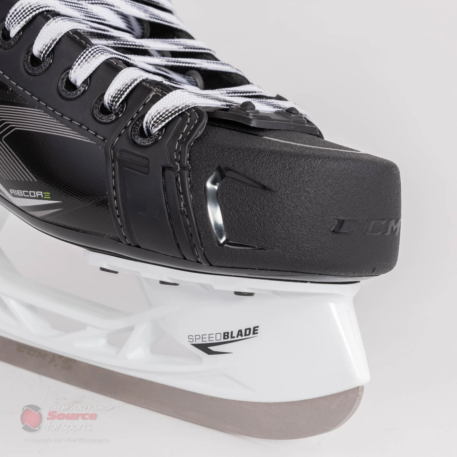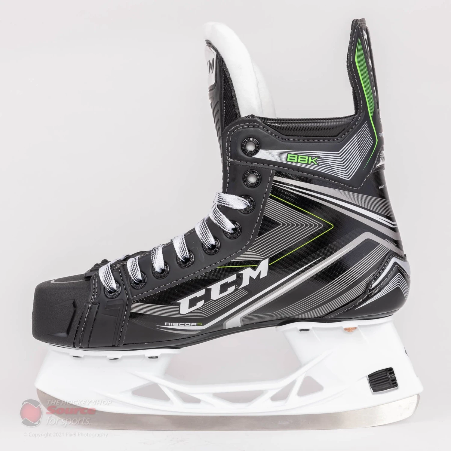 The new graphic for the CCM Ribcore 88k features a glossy silver lined pattern overtop a black finish. CCM finishes the boot off nicely with their classic Ribcore green accents along the tendon guard and base of the heel.