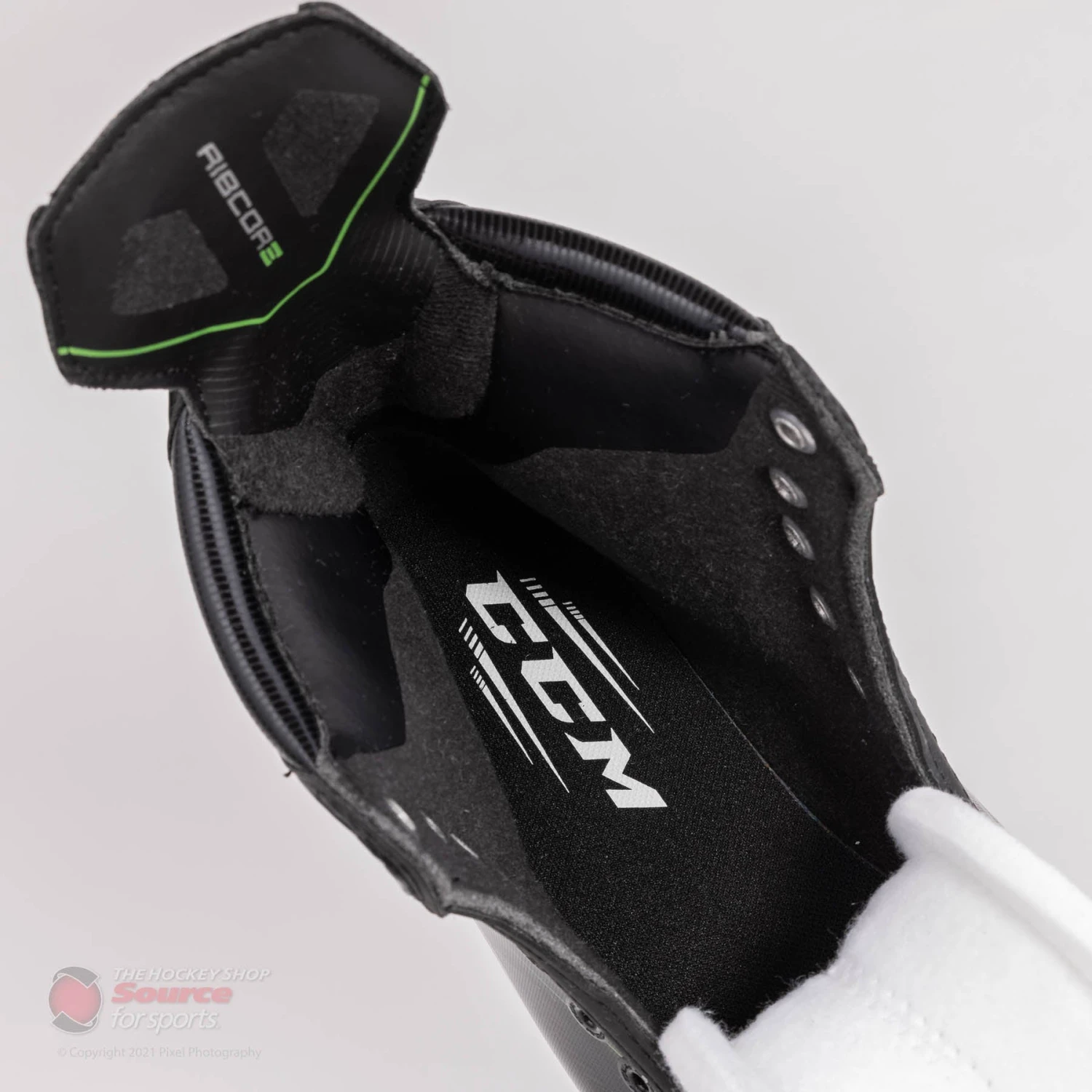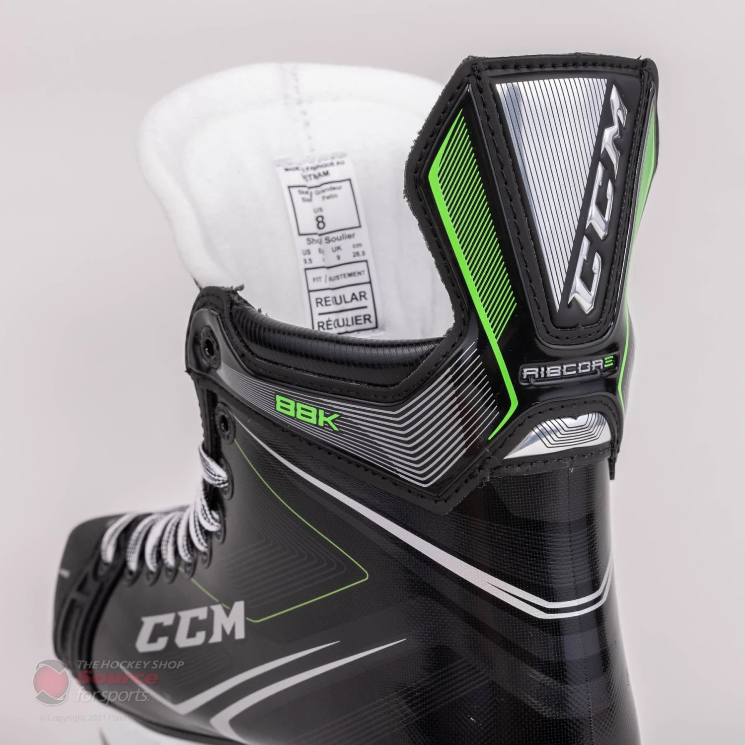 The new graphic for the CCM Ribcore 88K features a glossy silver lined pattern overtop a black finish. CCM finishes the boot off nicely with their classic Ribcore green accents along the tendon guard and base of the heel.